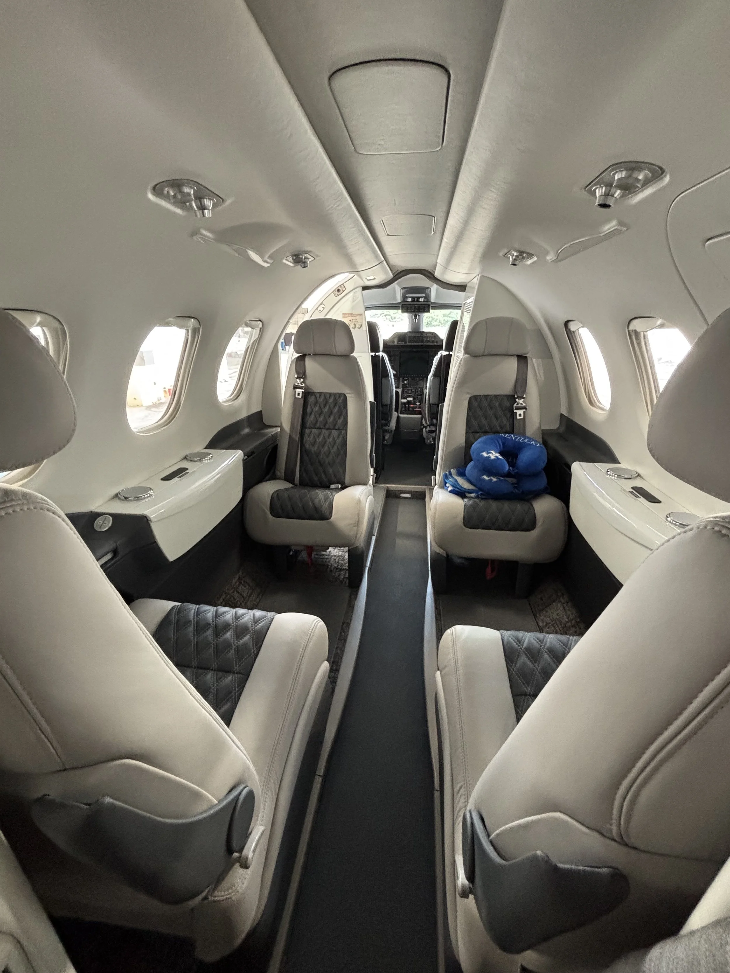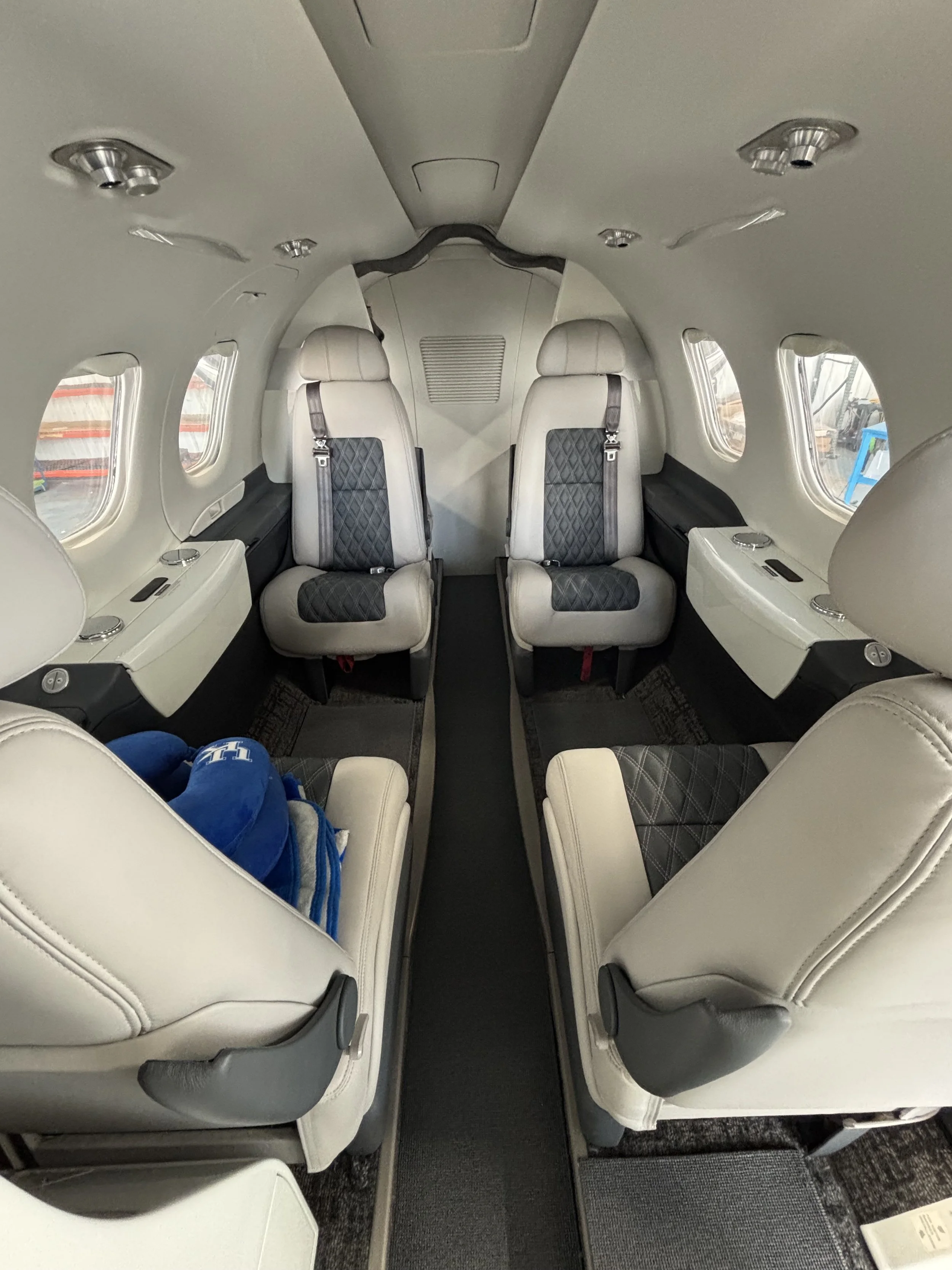 Redesigned in 2025, N75RZ’s cabin blends contemporary materials with ergonomic comfort. The four-seat club arrangement accommodates up to five passengers in a bright, quiet environment.